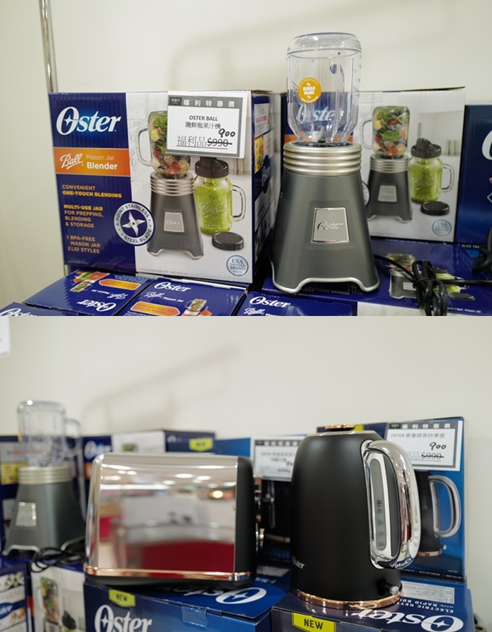 不管是快煮壺、烤麵包機、果汁機也都是它們家旗下的熱賣商品,且都是大家喜愛的美型家電,通通只要990元就可以帶回家,這一區的花車基本上都是990元,不用千元就可以帶回家。 |