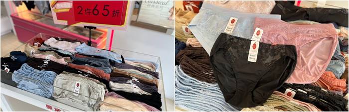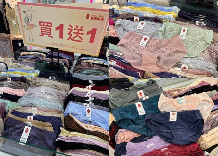 | 內衣兩套(件)65折 如果你想要入手這一區的單件小褲,那單件的單價較,兩件65折超划算,新款式非常多,現場備貨齊全,不管你是要平口還是低腰的小褲通通都有,顏色選擇性也非常多以外,曼黛瑪璉的小褲穿起來非常舒服,不會有勒感,蕾絲也很漂亮。