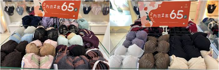 | 內衣兩套(件)65折 非常熱門的款式等著美眉們來挑選,不得不說這樣子掛在牆壁上的感覺,選購時更加一目了然,挑選內在美,第一個視覺印象一定要好,像這樣成套搭配,乾淨整潔又美觀,在門市挑選的好處,就是可以看到各種款式直接展示出來,她們家的很多人氣商品都是針對東方女性的體形設計的,低脊高脅X版型加上衣身下擺加寬非常受到歡迎,眾多熱賣款式明星商品怎麼能不來挑選。