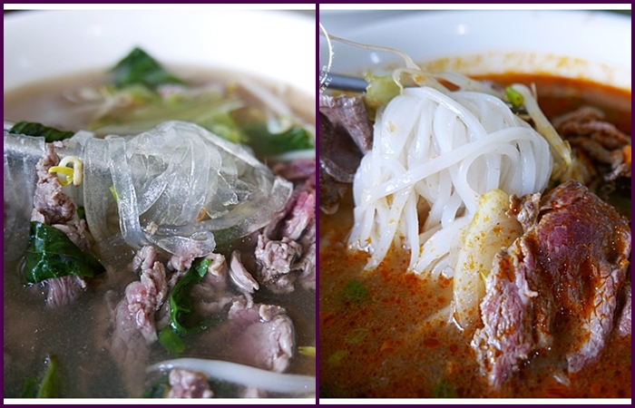 | 幫大家做了拼圖就看的出來兩者的差異性了!綠豆製的是幾乎透明像是冬粉一樣的麵條,但是綠豆河粉的韌性與冬粉不同唷!會比較緊密有嚼勁,而白色的就是米製河粉,是台灣人目前比較常吃的河粉種類 |