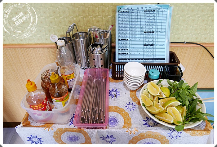 | 沒想到醬料桌整理得如此乾淨整齊~一般越式的醬料海鮮醬、辣椒醬、魚露等等應有盡有。讓我最驚豔的是阿蓮河粉竟然提供了超大量的新鮮檸檬,除了檸檬就連九層塔都免費提供在自助區上,讓寶妹不得不心生佩服的大器阿~吃了好幾家越式料理都還未曾看過有供應九層塔呢 |