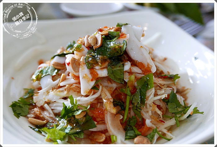 | 首先上桌是涼拌越式花枝$100,這一道會有一些些像是泰式的涼拌,但是泰式口味會很極端,不是太辣就是酸的太刺激,但寶妹會這麼喜歡越式料理就是因為他的口味一直都很溫和,是中的酸V程度會讓人愛不釋口,尤其這一道花枝才100元,裏頭的花枝清脆可口分量又多,我們一桌三個人吃都還吃不完呢! |