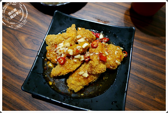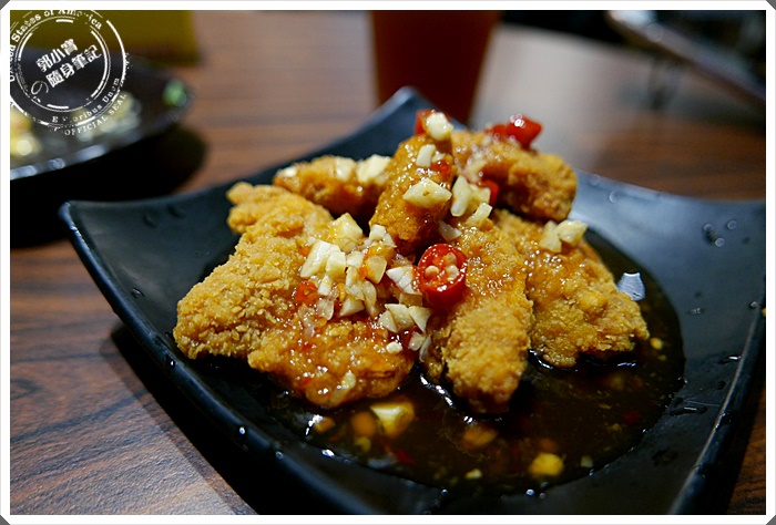| 還另外點了一份泰式椒麻雞來吃看看,一份50在宵夜來說份量不多不少,一共也有七八塊的雞肉塊~不過就是使用現成的炸雞肉塊,很像雞米花,但雞肉本身就有辣味了,辣度就像是勁辣雞腿堡的肉塊XDDDD |