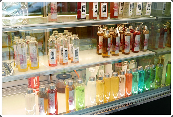 | 旁邊的玻璃展示櫃也滿滿的擺滿了準備好的半成品,如果有很多客人可能製作上還是要等待一下下,買飲料屬於趕時間類型的朋友千萬要三思唷XD好想要每一種都喝看看,基本調味都是使用了法國的果露來調製,不用擔心色素以及來源問題。 |
