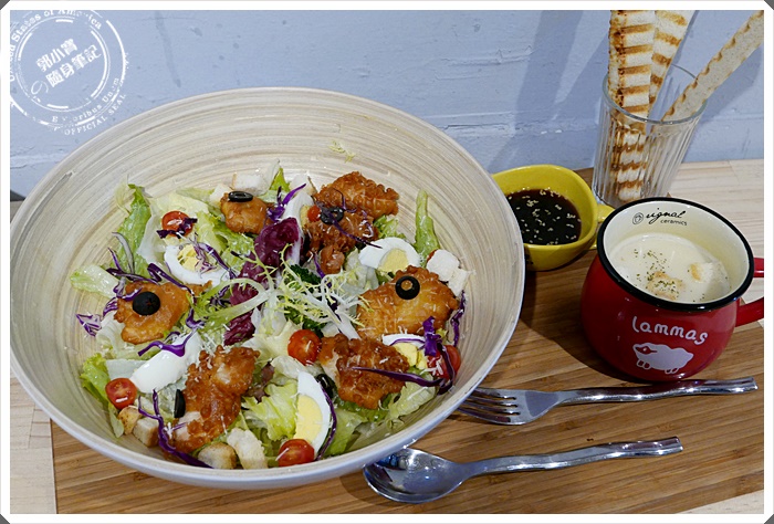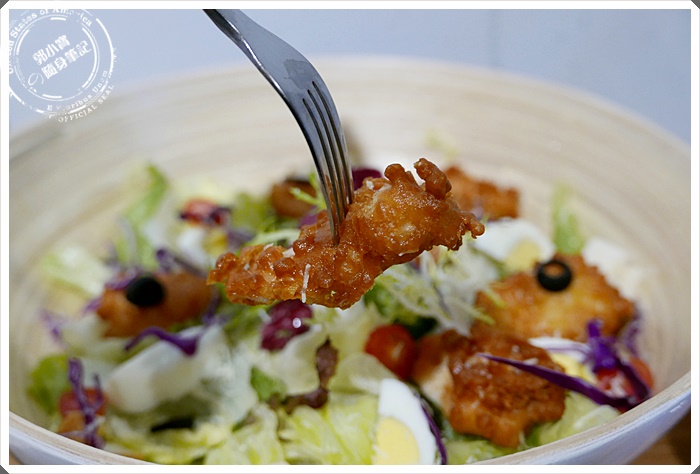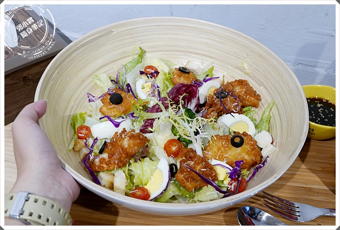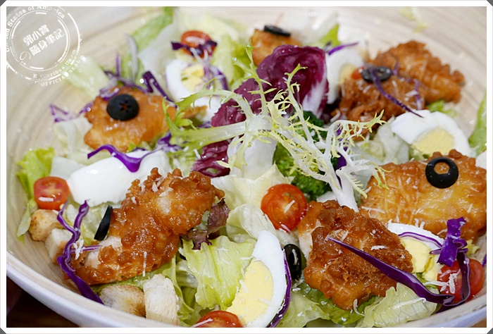 | 寶妹選擇的是帕瑪森起士佐唐揚雞肉鮮蔬沙拉,單點是$149,而寶妹是點套餐才$219,超大擺盤色香味俱全實在是太超值,幾乎什麼東西都包辦了 |