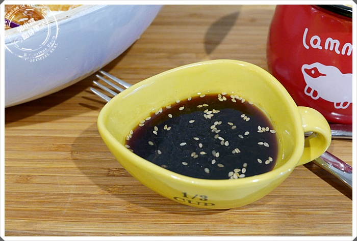 | 提供的是和風油醋醬,一開始寶妹放的不多,後來發現調整的剛剛好就毫不猶豫的整杯倒進大碗中跟沙拉一起吃掉了~ |