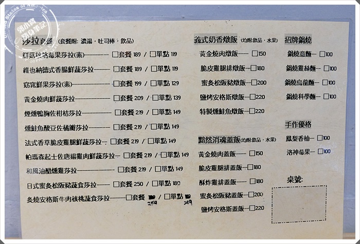 | 沒有想到小小店家竟然供應的選擇有這麼多!除了沙拉之外,就連燉飯蓋飯以及鍋燒麵食都有供應,仔細看沙拉的價格並不貴,即使是加了套餐也大約在兩百大洋上下,寶妹覺得這種店的風格還有價位我實在完全抵擋不了阿 |