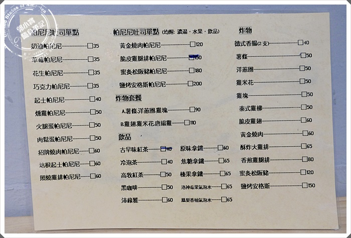 | 後頭則是有帕里尼吐司,可以單點也可以套餐的形式出餐,還有提供相當多的炸物,飲料的部分就是比較少一些些選擇。 |