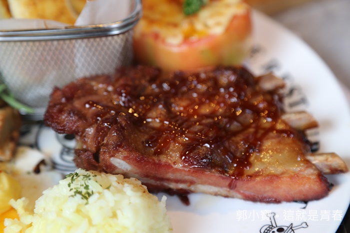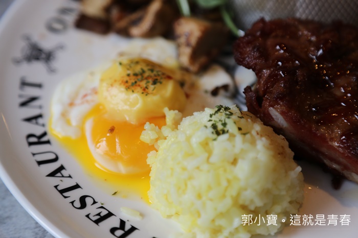 | 布魯克的主題套餐還滿貼切的,用麵包做出骨頭的樣子以外,還用肋排來代表布魯克,炒蘑菇搭配起司蛋,炒蘑菇熱熱吃還滿好吃的。 |