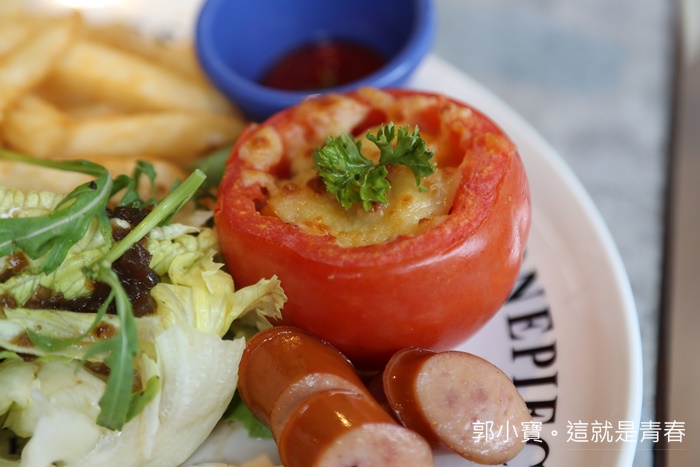 烤番茄上面是起司裡面忘記是甚麼東西切丁,其實我是去拍照的,航海王主題餐廳太多東西可以拍了。