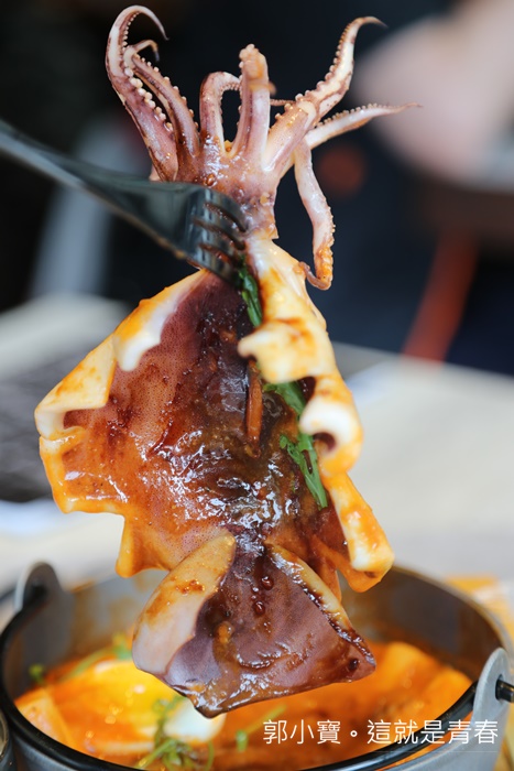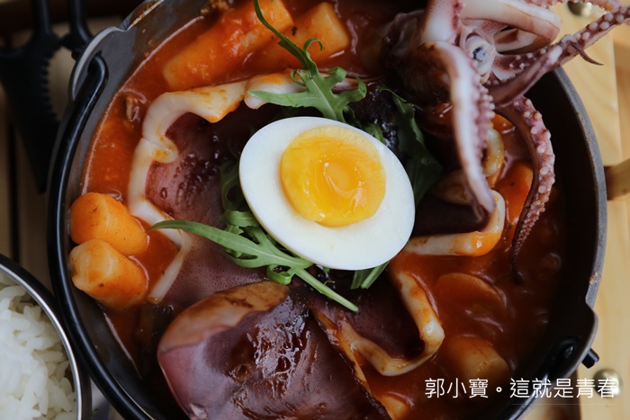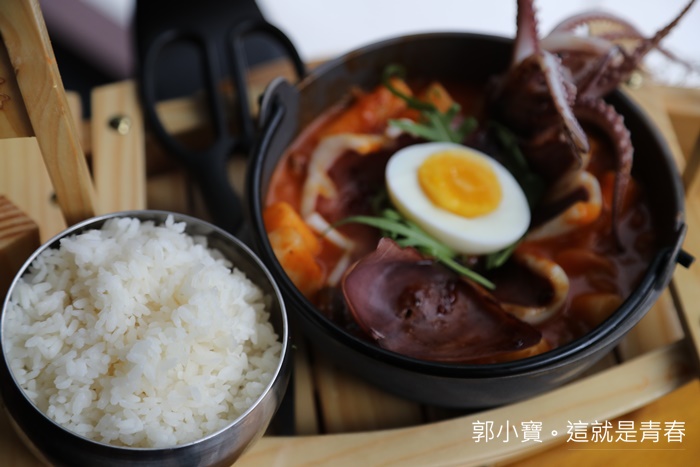 | 白飯搭配韓式辣鍋的套餐,主角就是人魚島上的大魷魚,其實應該是章魚@@ |