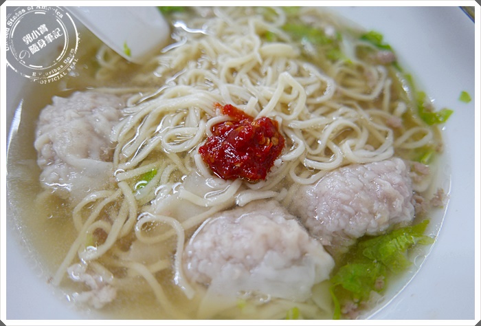 | 一碗小碗的餛飩湯麵有四顆潮州餛飩,是說同一條路上還有另一家潮州餛飩樣式也很像,飽滿的肉球狀,薄薄的外皮不像台式餛飩那樣有長長的金魚拖尾,簡潔有力的單純只包覆整顆餛飩。 |