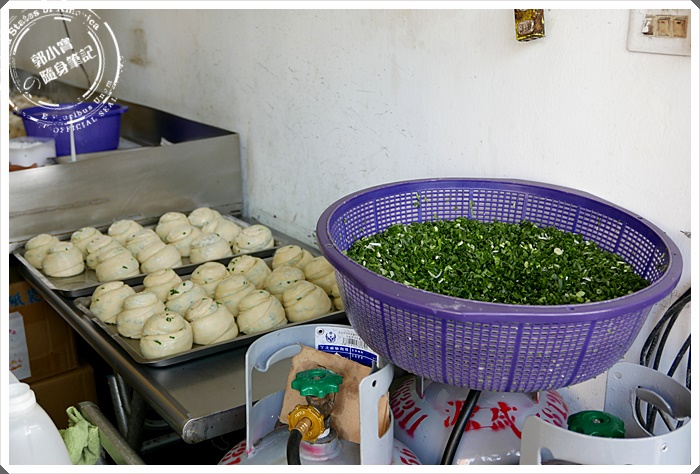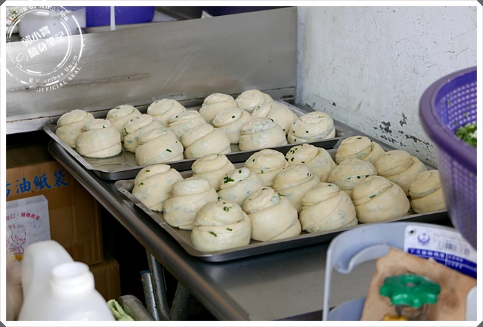| 製作台上旁邊那超大藍滿滿的蔥花真是誘人阿~旁邊還有一團團已經揉製好的麵糰。 |
