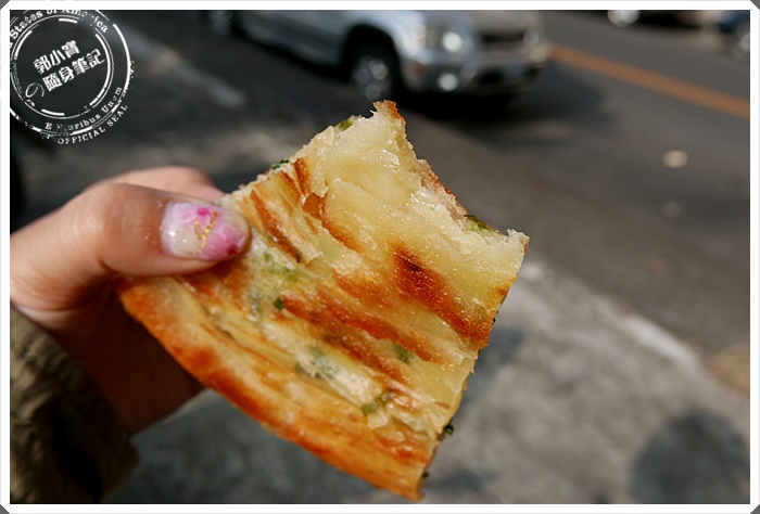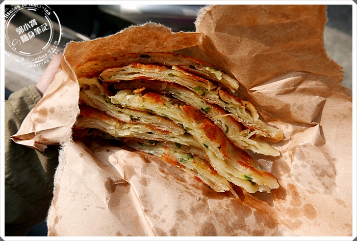 | 金黃焦脆的蔥油餅好誘人,口感因為還是有些厚實的程度,所以外皮很酥脆,而裏頭一層一層揉製的麵團讓入口的感覺層次更明顯~整個就是我的菜阿 |