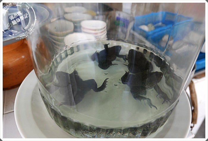 | 至於旁邊的玻璃缸裡頭的水蛙真的是阿將米糕的特色,老闆娘說他們的水蛙都是固定請人抓的,不是養的,養出來的水蛙肉質很碎爛沒嚼勁,就像是你進補吃到一般肉雞跟土雞肉的差別很類似,那天去剛好有位老人家點了清湯水蛙在進補中....我滿好奇現在的年輕人是不是真的敢吃@@,寶妹自己是不敢啦= =不過高雄賣清湯水蛙的已經不多了,還尤其是活的XDDD |