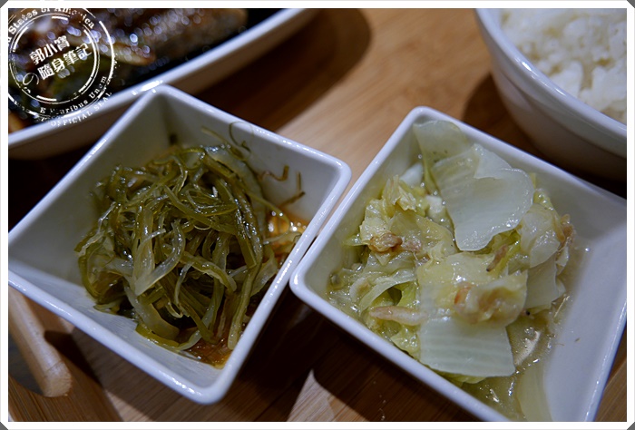 | 每日的更換不同兩樣小菜,今天那道烏醋海帶絲實在是好吃到我跟挑嘴的朋友W哥都不斷交耳讚賞甚至討論怎麼製作,超級清爽爽口實在不是我寶妹誇張阿,配菜在整份的套餐當中扮演了極為重要的平衡角色。 |