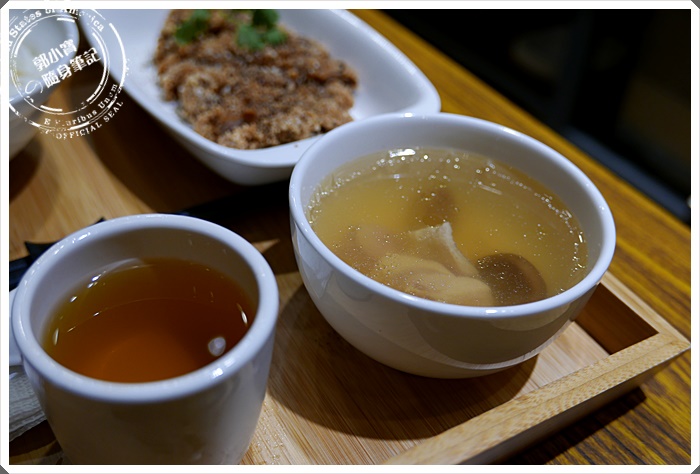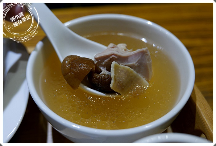 | 前面原本都看配湯是味增湯,沒想到輪到寶妹的上餐後味增湯賣完了,老闆換了香菇雞湯給我們享用,其實是我們賺到了XDDD,使用曬過的香菇,還有整碗湯的鹹度比例抓得很好,喝起來實在是過癮。 |
