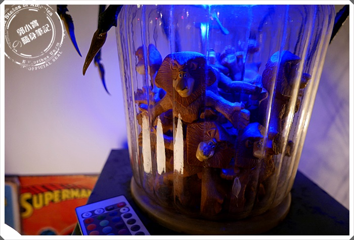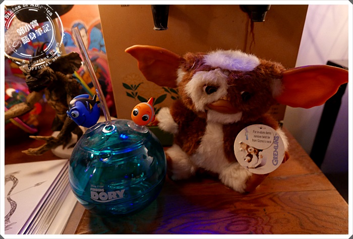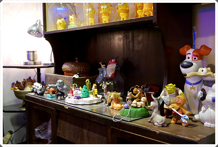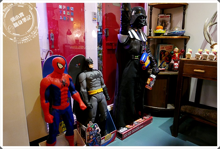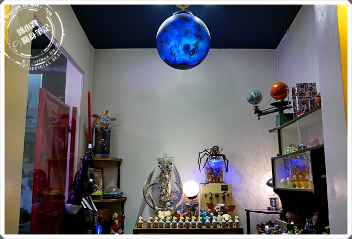 | 趁等餐點的時候寶妹先來尋寶一番~門邊有一整區完完全全都擺滿了收藏品,一開始上方的這顆行星燈超吸引我的目光阿~跟一般展示公仔的店品味不同,這裡是比較美式口味的復古店,而公仔的主題系列也比較偏美式一些。有地球、大蜘蛛、超多的老皮,還有很多看過但叫不出名字的玩偶。 |