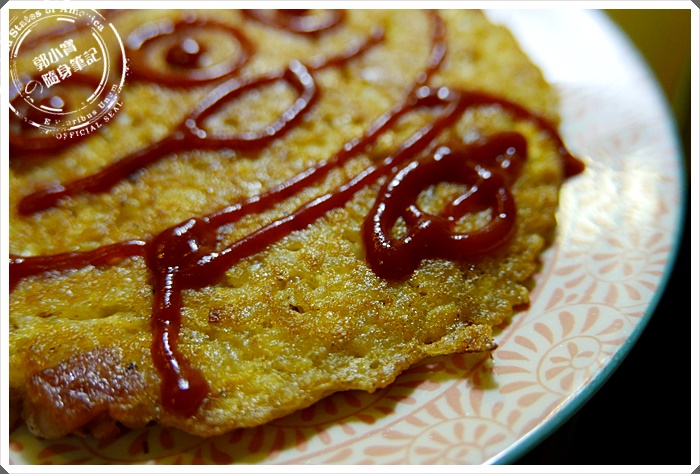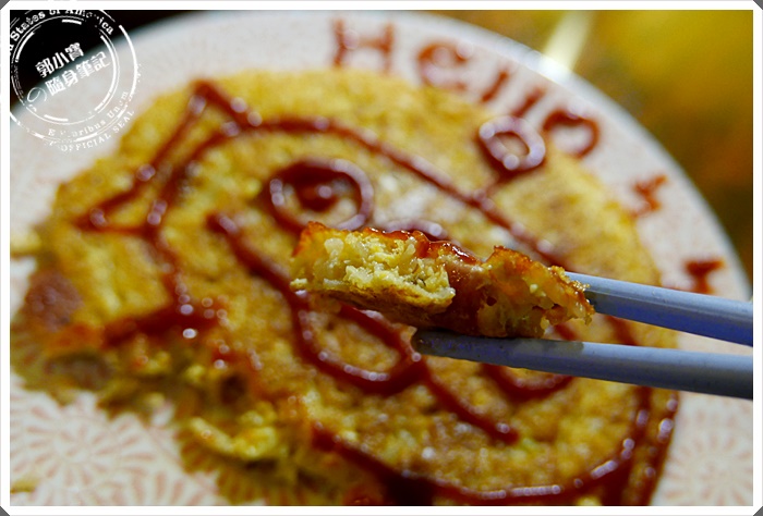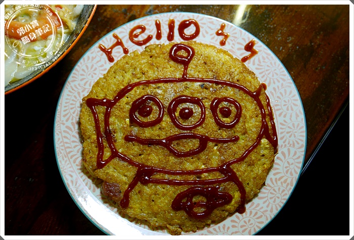 | 這個上桌實在是太可愛了啦~~~~一直尖叫,是三眼怪耶!大家應該有點好奇這是什麼,其實他不是煎餅喔,是煎飯,剛剛看到菜單覺得很特別就想要點來吃吃看~沒想到就有這麼讓人高興的番茄醬作畫,店家還寫上Hello ㄣㄣ 寶妹在心裡回答"我知道"XDDD |