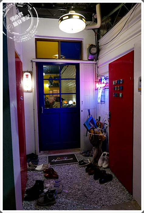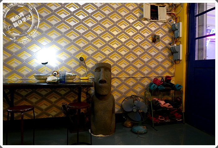 | 對於要脫鞋實在是半信半疑的寶妹進來還看到每個客人腳上都乖乖地套了拖鞋XDDD,拖鞋架在大門後面,然後竟然還有一尊超大的巨石摩艾像(超喜歡) |