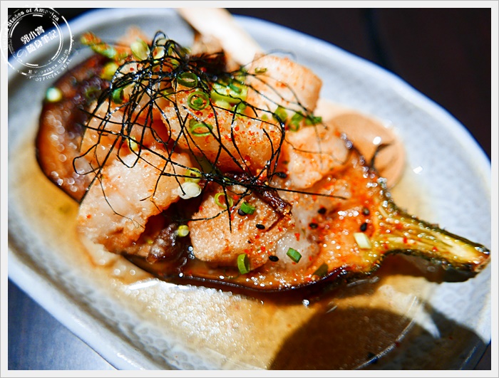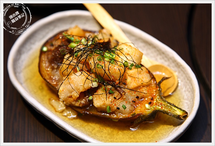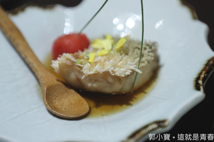 | 另一道令人驚艷的菜色,本來說是茄子大家都不太敢嘗試,茄子也太大條了吧,後來介紹這是日本的米茄子,不管是外型還是口感完全跟一般想像中的茄子是不一樣的,上面是明蝦,茄子並不像一般軟趴趴的口感,用湯匙挖一口茄肉搭配明蝦肉一起入口,那口感滋味層次相當的豐富,好吃又特別!!! |