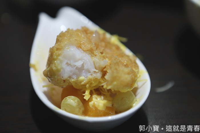 | 像拳頭一樣的蝦球也是大宅門乾鍋鴨頭的特色,也是很多大人小孩都喜歡的一道,果律蝦球是單顆計價,雖然像拳頭一樣大,但是單顆100元的價位我個人覺得爽度還滿高的,一口咬下那酥脆的粉皮跟彈牙的蝦肉,真的滿足到不行。 |