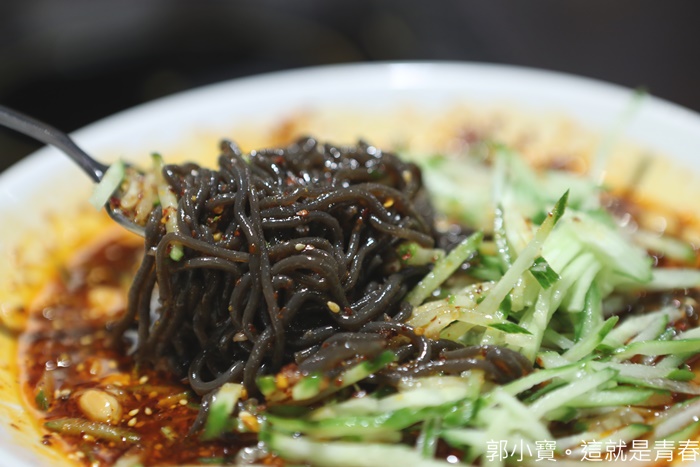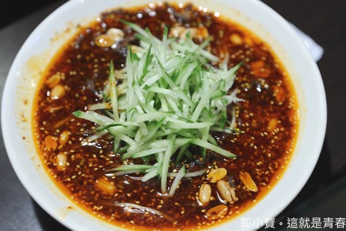 上桌的時候還滿搶眼的,紅咚咚的醬汁看起來很辣的樣子,其實沒有那麼的辣啦,加上小黃瓜切絲,下面本來以為是一般的麵條,不過看起來卻是很漂亮的一道菜。