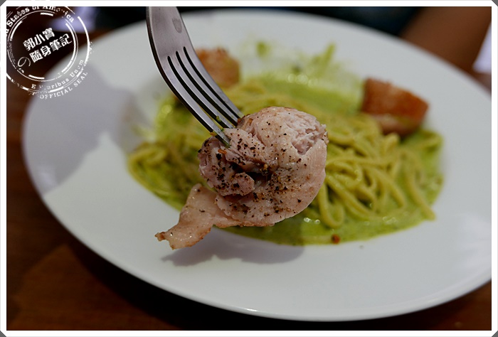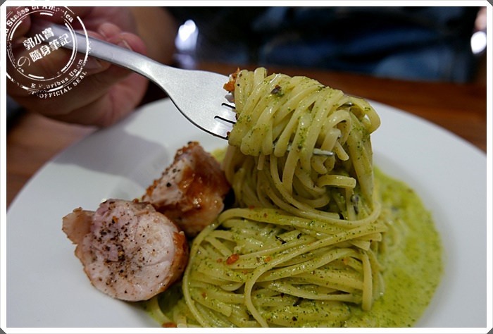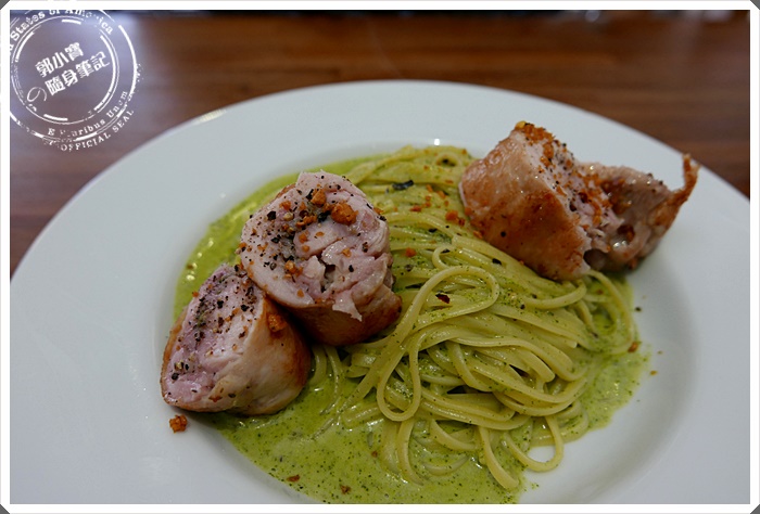 | 法式青醬雞腿捲$280~使用的麵條都是屬於細扁麵的,比較屬於不一樣的青醬,他們的青醬是比較有奶味的,加了牛奶下去一起混和,但不油膩,也比較沒有蘿勒的重口味,但整體是高雅的感覺,只是吃完整盤後會有些渴,還是偏鹹了點。, |