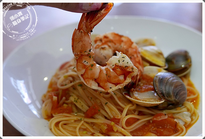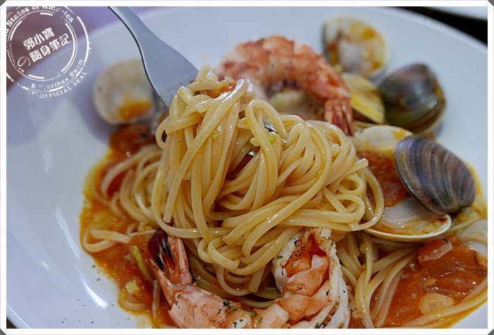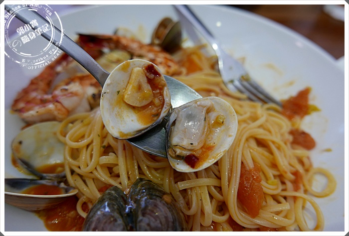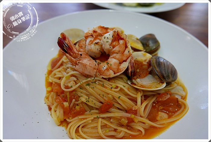 | 鮮蝦蛤蠣番茄$290~與茄汁系列還是不太一樣,妹近年來比較喜歡清炒類的義大利麵口味,長期感覺還是比較耐吃的阿^^,上頭有三隻大大隻的蝦子,就連蛤蠣都有八九顆,而且大小孩不小顆呢~ |