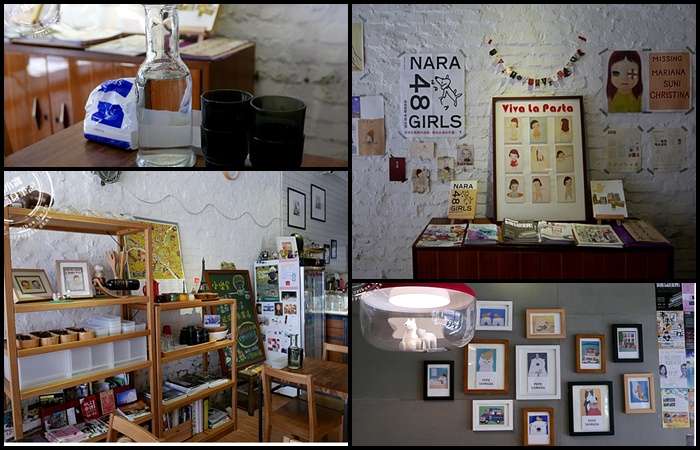| 木架子上有餐具水杯等等,這木架的質感很細膩,還有牆上有許多奈良美智的圖畫以及一些文藝活動的資訊,尤其第一桌上方那個北極熊的燈寶妹實在是超級愛的~北極熊是聰燈的開口自己放擺飾進去的,所以喜歡什麼就擺什麼實在是太讚了 |