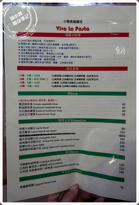 | 沒有服務費,每人低消180元。其實鹽埕這一頭有許多的外國人,Viva La Pasta小樂食義麵坊就連菜單都很歐美式,還是維持使用這樣隨興的護貝單,許多美式餐廳也都是像這樣的方式。 |