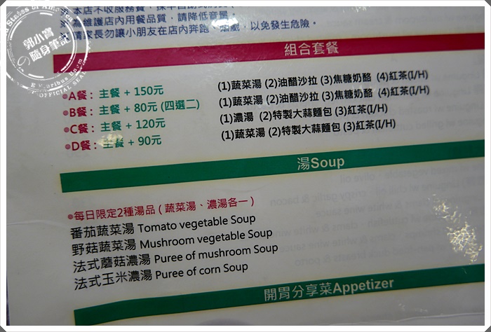 | 第一頁主要有套餐選項,而濃湯會每日供應濃湯、清湯各一,當日供應湯品會公告在店內的小黑板上。 |
