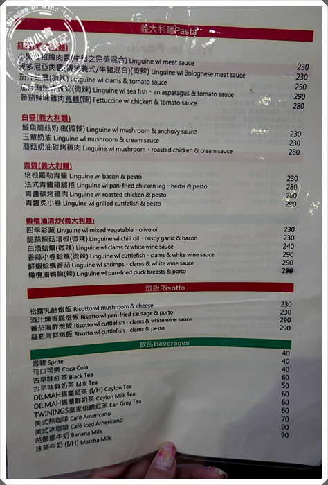 | 供應的只有義大利麵以及燉飯兩個品項,種類也算少,門口外面有展示餐點的圖片,進來用餐之前寶妹已經在外頭琢磨了一番,所以進來很快就決定好要吃什麼了~ |