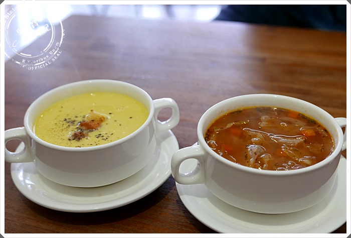 | 今天供應的是玉米濃湯以及番茄蔬菜湯,寶妹已經不知道有多久沒有看見義大利麵的餐廳,湯品上桌竟然可以燙的冒煙,簡直可喜可賀,給他一個大掌聲阿,用心的店家還能注意到小細節,寶妹跟朋友都挺滿意的,Viva La Pasta小樂食義麵坊的濃湯是屬於清淡版,但不代表不好喝唷~~濃湯有屬於他們自己的料理方式,有濃濃的奶味少了刻意增加的粉,喝起來十分淡雅。 |
