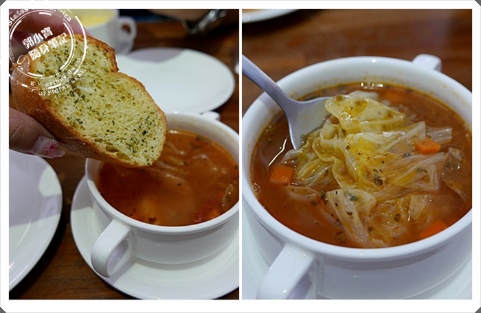 | 蔬菜湯更是一絕~你有看過這麼多料的附餐湯品嗎?簡直是大划算阿~~口味又十足濃厚,真的很想去問問她的食譜是怎麼熬出來的這麼好喝,外頭也不乏提供像這樣的義式蔬菜湯,可是湯底都會很淡,連隨行友人都嘖嘖稱奇,麵包是提供軟法,烤的熱熱的外脆內軟實在是香的不得了。 |