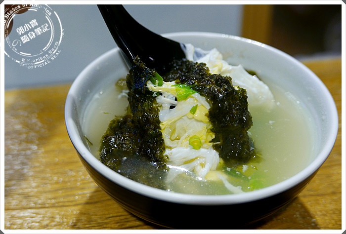 | 紫菜蛋花湯就平平,中規中矩的,只是自己是笨蛋點了糖心蛋還要喝蛋花湯是哪招?一整個就是自己在頭暈暈傻呼呼的用餐阿...點餐還是要再三思量,互相搭配才是美好的一餐阿,整體吃起來是環境不錯,麵條口感香Q,而且重點是慕禾麵家上餐很快,可能附近上班族實在是不少,上餐速度也會決定了大家的午休選擇。 |