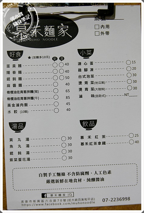 | 慕禾麵家其實除了麵類也有供應滷肉飯還有水餃,觀察一下大家桌上的餐食,竟然飯食還不少,最有名的是他的橄欖油佐青蔥拌麵,名字取的真有法式感,可惜寶妹今天真的對她興致缺缺,竟然自己胡亂的點了碗餛飩麵.....不過後來得知原來不同的麵使用的麵條也會不一樣唷 |