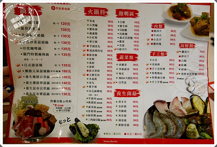| 近來就有服務生來招呼坐下,立刻翻起菜單先點鍋,原來種類還不少,大致上的價格落在120到140之間並不特別貴,加點的項目也挺多的,火鍋料則是可以按照顏色標記,綠色兩盤50,紅色兩盤90元。 |