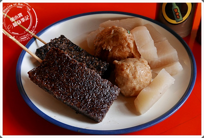 | 已經有烤黑輪了,就點了米血來嚐嚐,外加兩顆蛋丸還有菜頭,米血寶妹大推,相當柔軟透心,軟Q加上醬料就是超讚的台灣小吃,蛋丸口味都是普通,但菜頭超香甜,已經滾的超級透心的絕對是我的愛。 |