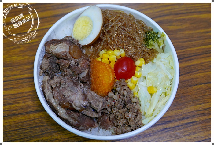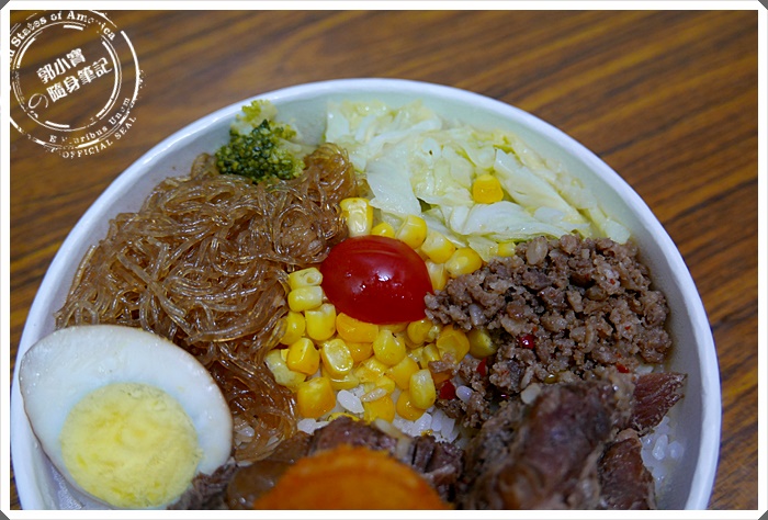 | 配菜實在是多到不可思議,這樣的便當真的才80圓嗎?配菜根本不是三菜一主食,根本嚴格算起來有六樣菜,半顆滷蛋、粉絲、高麗菜、玉米、竟然配上泰式打拋豬肉簡直無敵,重點式還有一個干貝酥,這也未免太划算了@@ |