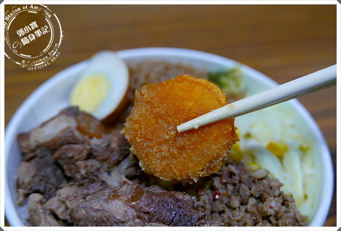 | 裏頭竟然有一塊寶妹超愛吃的干貝酥,這對於便當店來說成本並不便宜耶~簡直就是下重本的,這干貝酥已經好久都沒有看過牠的蹤跡了阿。 |