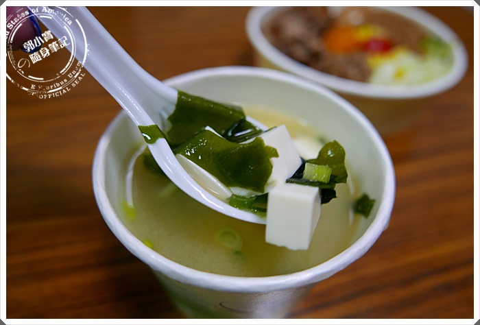 | 海帶芽湯有點便當只要再加20元而已,如果單點是30大洋,但寶妹覺得CP值超好,不但味增順口,裏頭的豆腐是大塊料又多,而且豆腐形狀幾乎都是完好沒有破碎~~不加點一杯湯暖暖胃,真的會很可惜唷^^ |