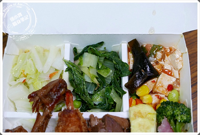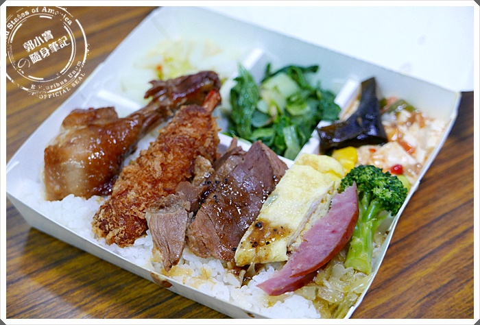 | 今天點的是什錦便當,在圖片上看來看去琢磨了好久覺得還是什錦看起來的CP值最高,三樣主食讓整個便當看起來超級彭湃,旁邊還多了玉子蛋、花椰菜以及香腸片,後面還有三樣蔬菜,整個CP值爆表阿~ |
