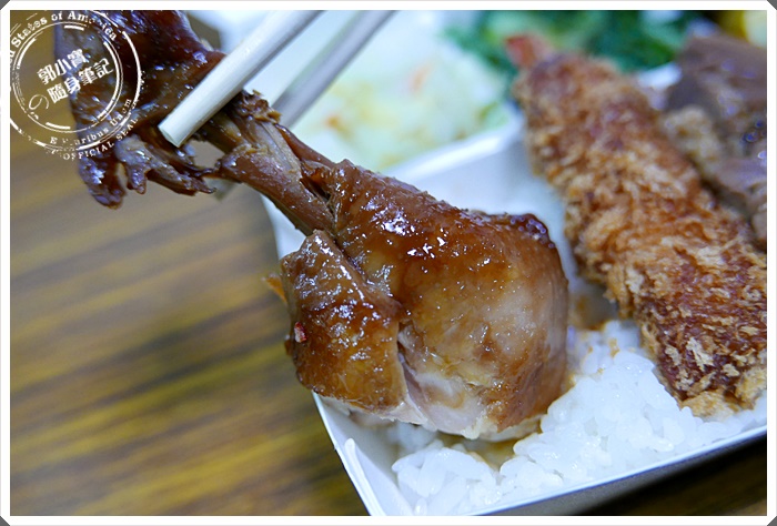 | 雞腿雖然只有小小的一節,但滷得相當好吃,口感也挺嫩的,看來就算點個雞腿便當也是不錯的選擇,尤其那雞皮滷的真香。 |