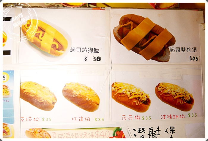 | 這樣有起士的熱狗堡才$35元~~~比小七大亨堡還要划算阿!尤其是阿姨自創的起士雙狗堡$45,更是這邊大人小孩的熱門商品。 |