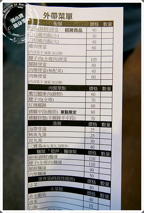 | 這是外帶版的菜單,便當的話就是有附上配菜,最最招牌的當然就是腳褲便當了,在市區中販賣豬腳便當一個才90元,我個人覺得算是非常划算的。其中也有麵線可以選擇,有些比較稀少部位則是要單點才有提供~還有手切的雞肉飯也讓我滿感興趣的。 |