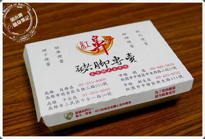 | 沒有想到外帶的便當盒也不小,上頭還印著紅鼻子的字樣以及分店資訊。 |