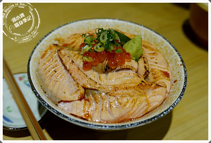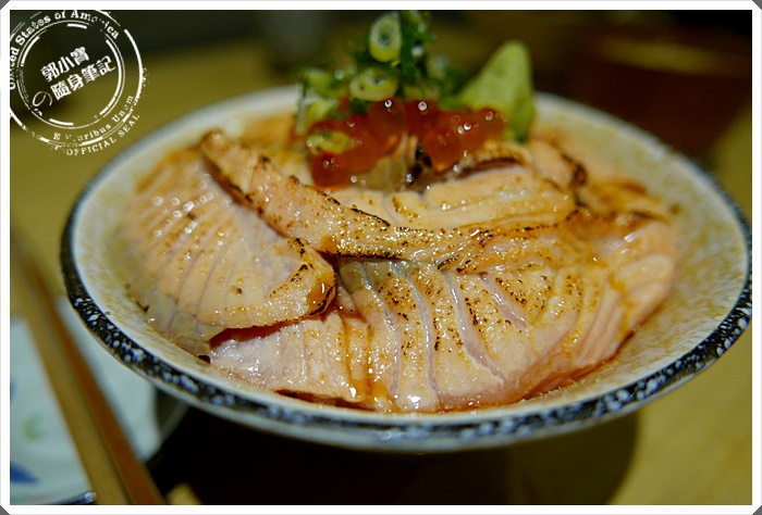 | 非常熱門的炙鮭魚丼飯$250,尺寸中等,上頭還有供應些許的鮭魚卵,果然跟照片一樣看起來誘人~ |