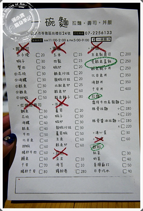| 來到第二張餐單,沒想到.....太晚來了都被店家售完畫上一堆XX....嗚嗚嗚~沒有看到壽司啊~怎麼這樣?生意也太好了吧(淚奔)不過拉麵類都還有供應的。 |