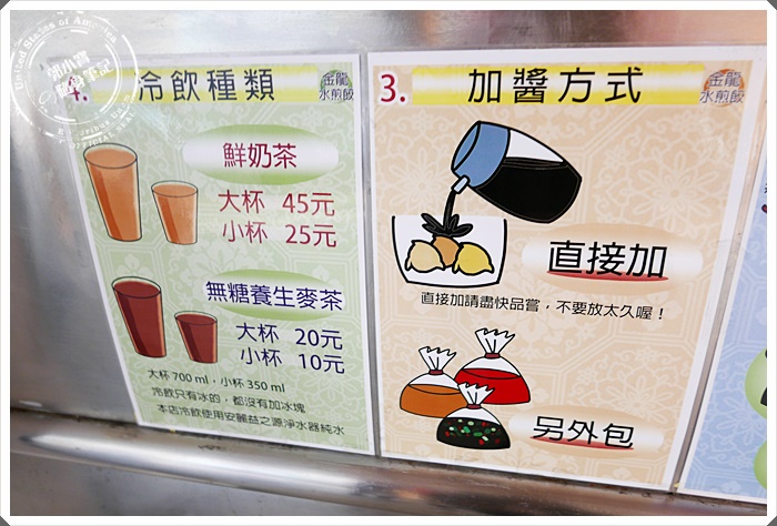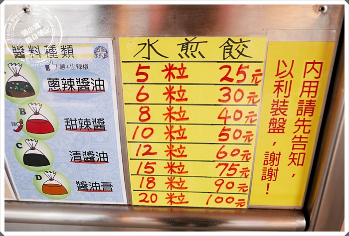 | 現在似乎是五顆起跳,平均是每顆五元,雖然寶妹怎麼樣也想不透兩年的價格竟然可以長到翻倍,但有些餓了還是乖乖地一口氣點了十顆煎餃。而醬料也很清楚地用圖片告知客人種類,有四種可以讓客人選擇搭配。 |